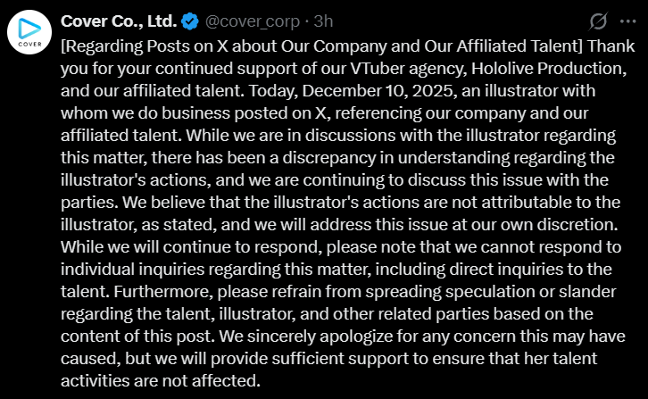 Кроме того, касательно таких закрытых рабочих взаимодействий с таланткой (госпожой Итидзё Ририка) и Cover Corporation, я в январе 2025 года обратился к руководству (Cover Corporation) с просьбой об исправлении ситуации и сообщил, что до внесения изменений прекращаю принимать новые заказы от компании.
