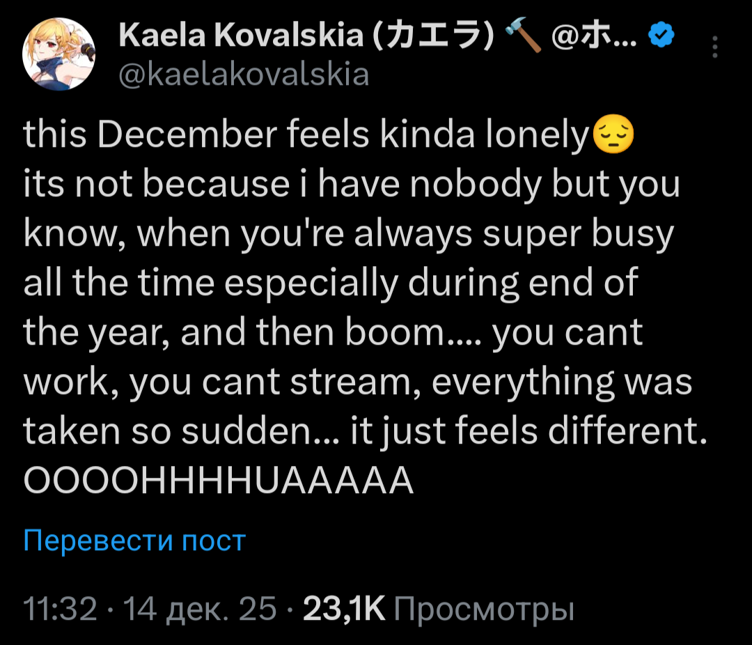 Читая между строк – Ририке нужно связаться со своим менеджментом по поводу работы, которую она хочет заказать, менеджмент связывается с Cover, Cover связывается с художником, работа выполняется, художник связывается с Cover, Cover связывается с менеджментом Ририки, а менеджмент связывается с Ририкой. И так по кругу для каждой отдельной правки. Художник, разочаровавшись, обращается в Cover и заявляет, что больше не будет для них работать, пока они не наведут порядок. В ОКТЯБРЕ Cover наконец выходит на связь с художником и начинает переговоры об улучшениях. К несчастью, на следующий день Ририка в стриме заявляет, что ни она, ни её менеджмент не имели никаких личных контактов с художником. Это срывает только начатые переговоры и вынуждает художника требовать извинений, поскольку Ририка солгала об отсутствии общения. Cover снова выходит на связь лишь две недели спустя, на этот раз заявляя, что внести изменения в рабочий процесс будет ОЧЕНЬ сложно. 30 октября и 20 ноября её юридические представители сообщают Cover, что сторонам необходимо найти решение. 3 декабря Cover отвечает, что не может добровольно изменить установленный порядок работы (то есть, по сути: скажите своему юристу, что для изменений придётся подавать на нас в суд).