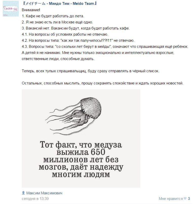 > 4.3. Вопросы типа: "со скольки лет берут в мейды", означают что спрашивающая ещё ребёнок. А детей я не нанимаю. Мне нужны только эмоционально и интеллектуально взрослые, ответственные люди, способные думать. > Теперь, всех тупых спрашивальщиц, буду сразу отправлять в чёрный список. Всё ясно. Переименовывайте парашу в цундере-кафе. Хотя тут скорее даже просто совок-кафе, судя по месту расположения, интерьеру и уровню воспитанности даже самого главпетуха.