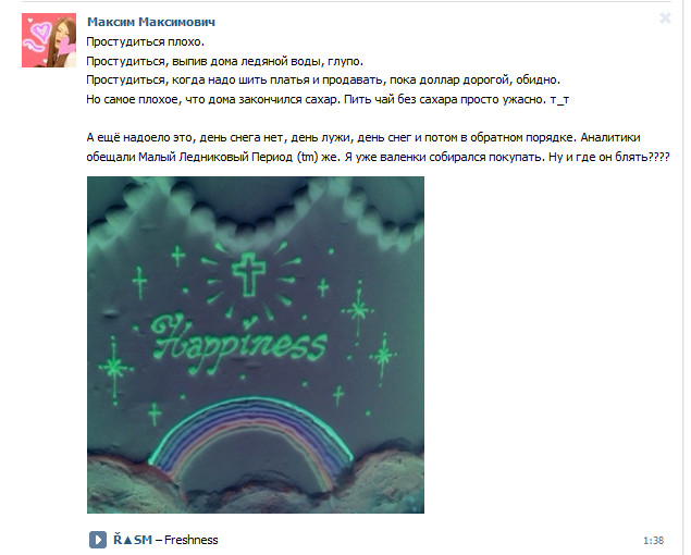 >>42434 >Неленивые могут капсить, а то говорят, что Макс каменты трет. Не все. В тексте первоначального поста было одно замечание которое задело Еву и она написала коммент. Я удалил это замечание и удалил сам коммент. В дальнейшем общении под постом об этом сказано. Так что ничего преступного я по сути не совершил :-)