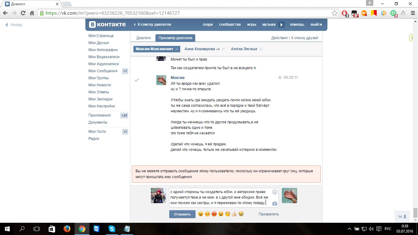 что касается принта, я ей по доброте пообещал (вот чёрт меня дёрнул ляпнуть это) что я не буду печать его второй раз. ну так и не напечатал именно его, я сделал новый. да там несколько элементов из старого, общая идея та же, но это ж блять другой принт! я же конечную картинку ей пообещал а не права на всю свою деятельность... но она прицепилась к "эксклюзивности", типа вот такая юбка, моего производства, должна быть только у неё и больше ни у кого ничего похожего... кароче так меня заебала эта история. и ведь было бы из-за чего драму раскручивать. на хуй я вообще взялся за это… просто пиздец...