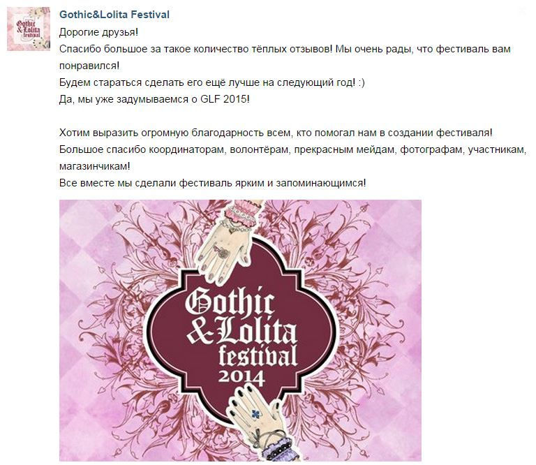 >Время подвести итоги конкурса в честь 5 летия Gothic&Lolita Festival. >К нашему большому сожалению в конкурсе приняло участие всего 3 человека. При таком количестве участников и двух призов, конкурс перестает быть конкурсом. Поэтому в этот раз победителей у нас не будет. Так же как и не будет проигравших. >победителей у нас не будет