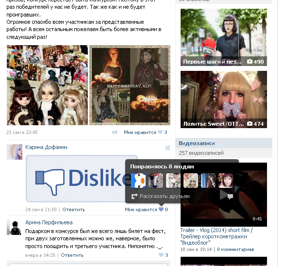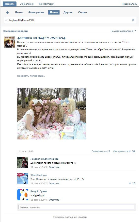 В качестве следующего нововведения мы хотим перенять традицию западного эгл и ввести "Тему месяца". В течение месяца мы ждем ваших постов на заданную тему. Тема сентября "Мероприятия". Разумеется лолитные ;) Вы можете публиковать видео, статьи, туториалы или просто свои размышления, касающиеся любых мероприятий в стиле. Как собраться на фестиваль, что ни в коем случае нельзя забыть с собой на мит, истории ваших лучших и худших "выходов в свет" и т.д. Посты помечайте хэштегом #eglmonthlytheme + номер месяца. например хэштэг для темы сентября 2014 года будет выглядеть так #eglmonthlytheme0914 Все темы и их тэги будут собраны в главном посте. тема для статей/историй http://vk.com/topic-178748_30721893 Ну и наконец, для того, чтобы поиск по тэгам был возможным, мы делаем группу открытой. > прошла половина месяца > на "тему" похуй даже админам Я правильно понимаю, что эта ебала была просто отмазкой для Хуррдурушки, чтобы сделать группу открытой хоть под каким-нибудь предлогом кроме "Анон в очередной раз взъебал меня, тупую шлюху, и я попёрлась исполнять волю почтенных леди, потому что они правы, а я алкаш без мозгов нихуя не знаю, что для группы лучше"?