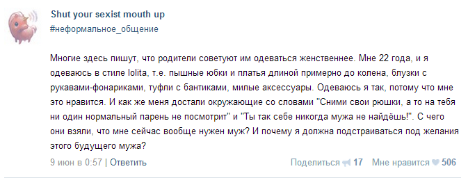 Если ты не админишь, не админь, никто не заставляет, выкладывай фото по делу и в стиле. Эти высеры в альбоме дейли приводит к появлению начинашек, которые собирают образы из шкафа, удивляясь, когда их потом критикуют. И наше соо похоже на парашу.