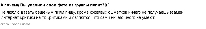 >>16148 >Плечи что ли? не угадала. я вижу одно - баба в 30 лет сидит и унижает какого-то подростка, который о ней в своих ресурсах не упоминает и на рожон не лезет, первым не пишет. Ты Мраазь защищать чть ли будешь? я не говорю что пингви хорошая. В 19 лет можно было бы и по мудрее себя вести. Но Мраазь объективно ведет себя хуже. И в аске Гамерман кстати о Мраазь всего 1 ответ, и то новый, в котором она довольно прилично высказываться о ней, в отличие опять же от той же взрослой тетки, которая старше нее в 2 раза. Я спрашиваю, они рили такая поехавшая или нет? кто был с ней на мит ах, че она говорит?
