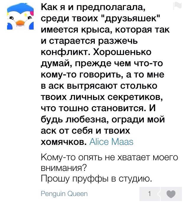 Слушайте, а мраась вообще вменяемая, не? почитала аск и сложилось впечатление, что она просто шизофреничка. Особенно приколол ответ про Гамерман и Дофамин. Про пингву тоже херь пишет полную. в чем прикол вообще?