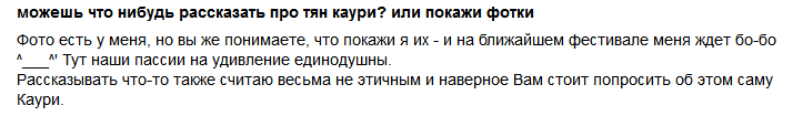 >>32193 И опять люди путают теплое с мягким, а спрашивающих с тематикой вопросов. Если ваша багинька готова отвечать на вопросы анонимусов, это не означает, что она готова всю жизнь свою вываливать в интернет.