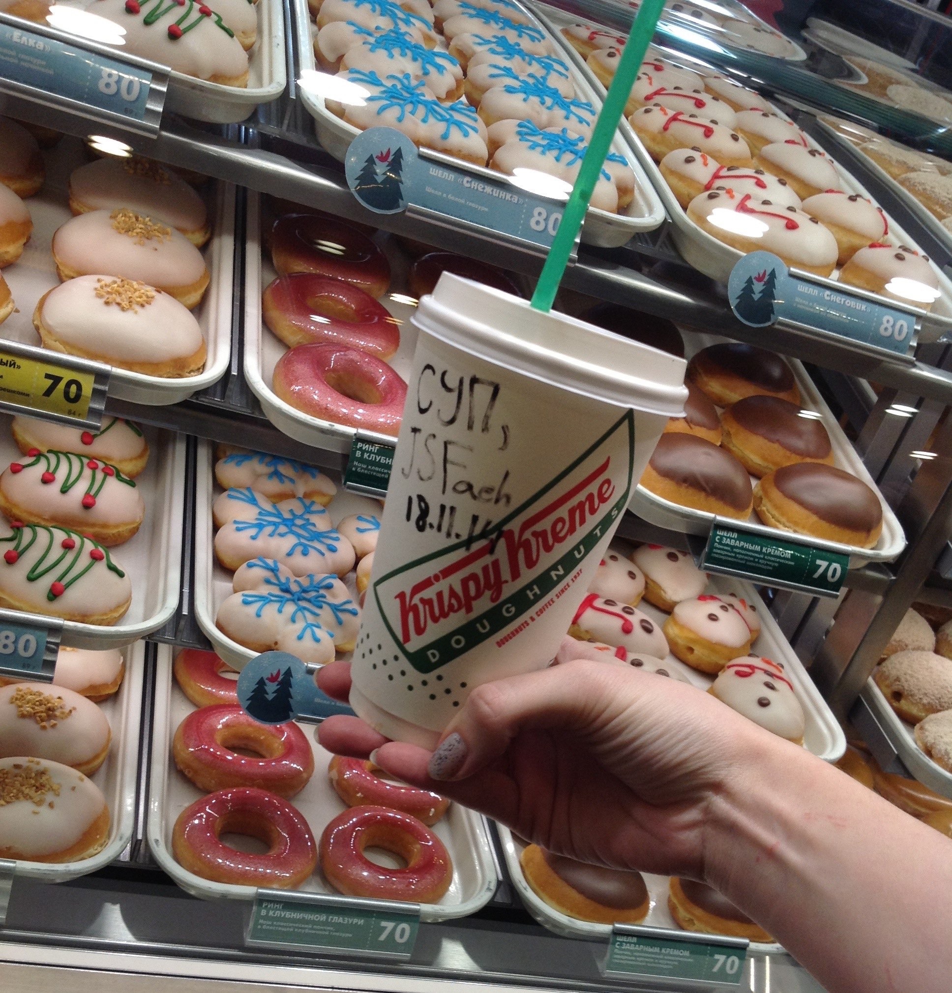 18:00 в кафе Krispy Kreme на станции метро Чистые Пруды (м.Чистые Пруды - ул. Мясницкая, д. 13, стр. 3.)