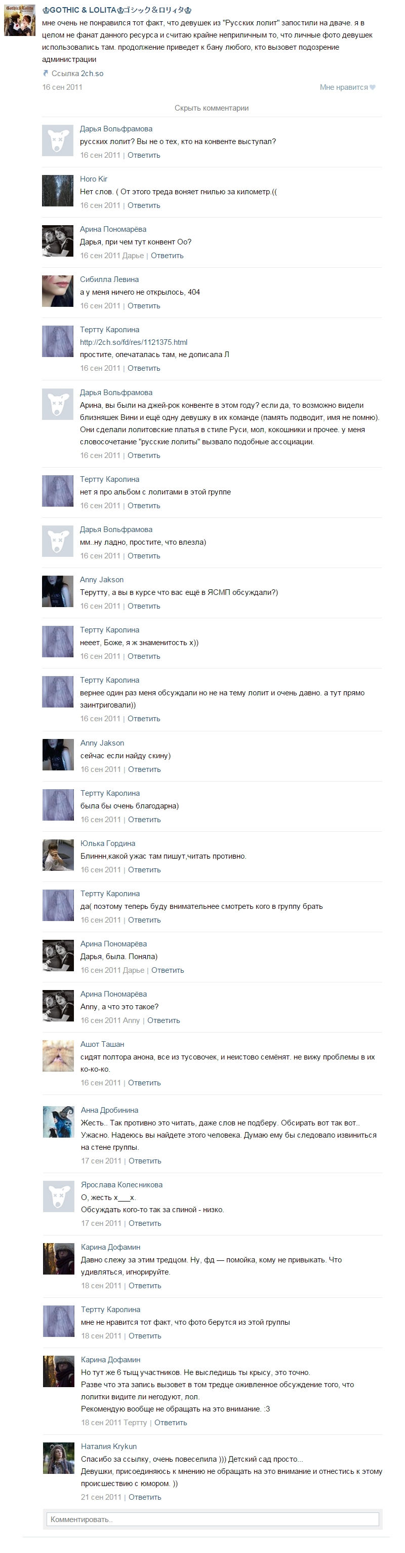 На всякий случай заскриню дискач, чтобы исключить вандальные ворывы у бесноватого ебанавта, который всё никак не расстанется с админкой группы, к теме которой уже не имеет никакого отношения дохуя времени. Может показаться удивительным, что скрин аж 2011 года, но действующие лица нам всем хорошо знакомы. ОбосранкаЧерМеш, Блядиша и даже - ОПА-ПА! - Дробоуебина. Вот они, ветераны не лолитача, но первых лолитных тредов. Уверена, они могли бы рассказать нам чуть подробнее о тех событиях, если не заговнятся у себя под шконарем, на хуе у нового куна или не продолжат отрицать, что просиживают здесь свою траповскую сраку, соответственно.