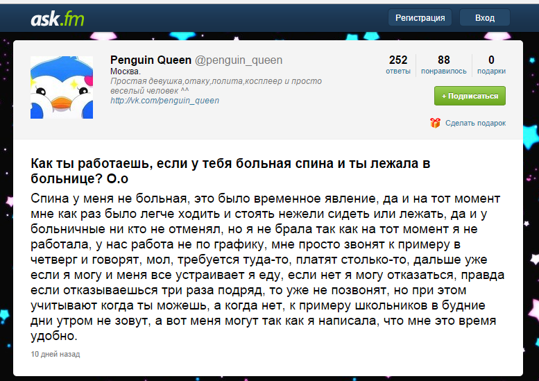 Плюсую этих достойных леди, Пингвин - ЛИЧНОСТЬ, которая смогла принять РЕШЕНИЕ Все профессии нужны, все профессии важны! Она работает, она приносит пользу людям, она не тянет деньги с мамки которая судя по мейл-ответам ее ненавидит и шлет на хуй, но это уже - детали Ведь действительно есть чему завидовать - сила духа, СМЕЛОСТЬ, отвага и, видно, мастерство, раз у нее вон какие шмоточки теперь. Пингва идет по своему жизненному пути, высоко подняв голову и раскрыв рот, а корзинки только и могут, что моралфажно бугурдить на двощах и грозить плюнуть сабжу в чай, хотя прекрасно знают, что ирл сабжа они не увидят никогда