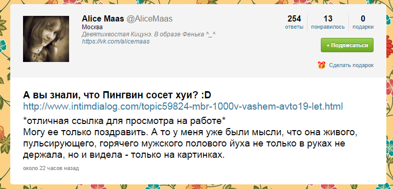 Алсо, что за цирк слабоумия вы тут развели? Нашли одну объяву и по ней нафантазировали всю её жизнь. Чем она болеет, как именно сосёт и т.д. Причём все фантазии в ключе: "ахаха какая она идиотка, а я умная". Мне кажется, каждая из вас должна вот прям щас взять и отправить Пингве по штукарю, за то, что вы тут пользуетесь её телом для собственного удовольствия.