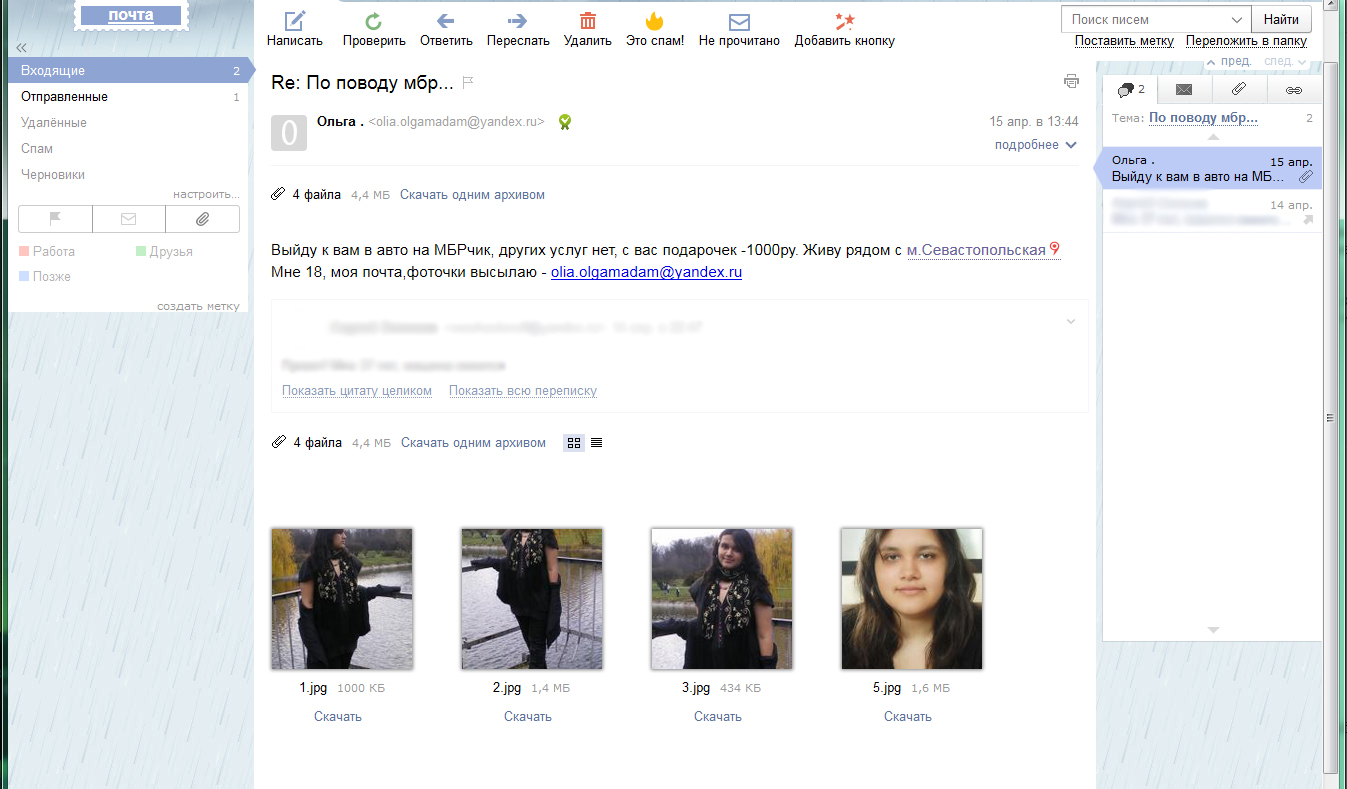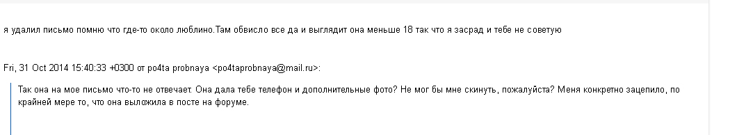 >>28459 Завершение драмы :3 Вы меня спросите, что же будет, если написать на прилагаемую почту [email protected] под видом клиента? Свои данные я замазала, мало ли фейкопочта пригодится еще. Вы удивитесь, но Пингвин не только быстро отвечает, но и высылает свои новые фотки. Отвечает она правда невпопад, текстом копированным из своего же объявления, видимо клиентов куча и нет времени индивидуально подойти к каждому. А фоточки то новые. Одна только старая, а остальные - свежак. Как вам такие пруфы, сосисы? :3