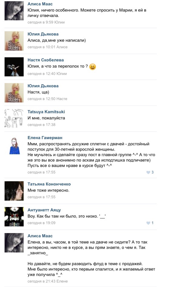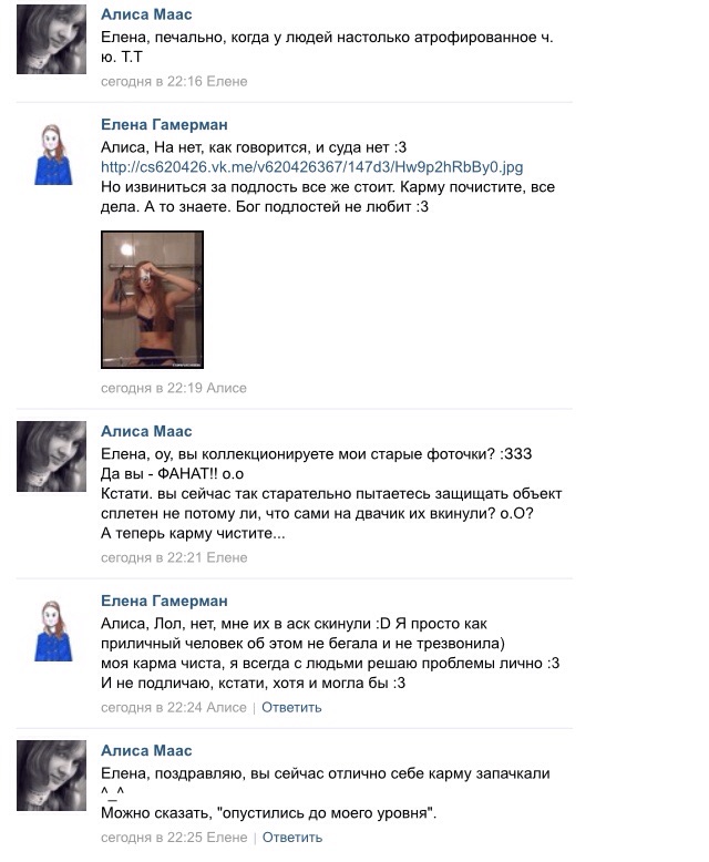 >>17413 после чего Ленка кинула пруффы самописания вопросов и того что маас флудит ей в аск. После чего потребовала извиняться перед пингвином за рассылку сплетен и тупые вопросы в аск и перед ней за вылетое дерьмо при условии, что если Маас не извиниться то плечи скинет голые фотки маас. маас сыграла дуру и не извинилась, на что Гамерман скинула фотку. Ну и Маас ясен пень заныла мол это низко и хули скинули :D Гамерман сказала надо было раньше думать мол и не говнить. После чего сказала "го в лс или зассал? " а потом их потерли.