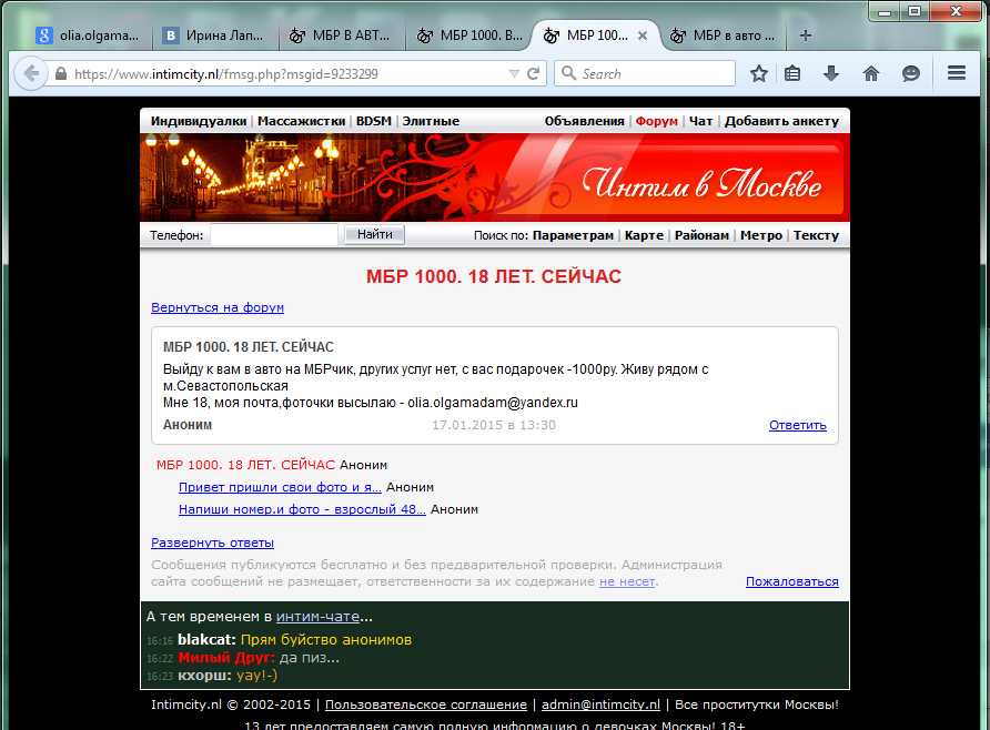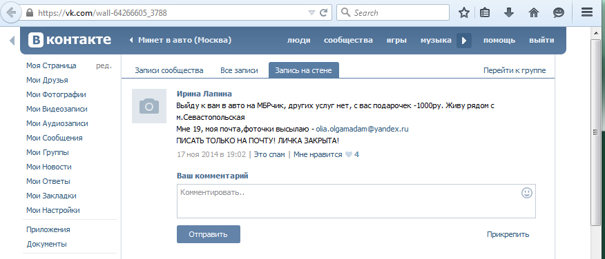>>28457 Продолжаем :3 Гуглится ли мыло? Конечно гуглится! (первый скрин) Что мы там видим кроме кучи таких же объявлений? Да это же какое то объявление в группе на стеночке вконтактике? Ирина Лапина?(скрин 2) Объявление как объявление, мыло то же самое, но фейк имеет удивительно знакомый контактовский ID(скрин 3). Остальные объявления один в один, можете сами убедиться и дополнить если чего обнаружите(скрин 4).