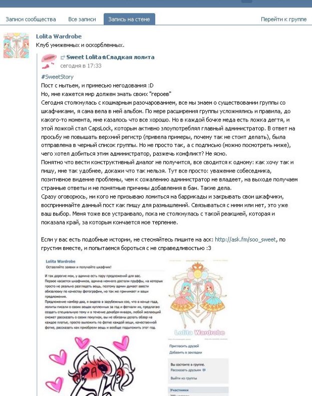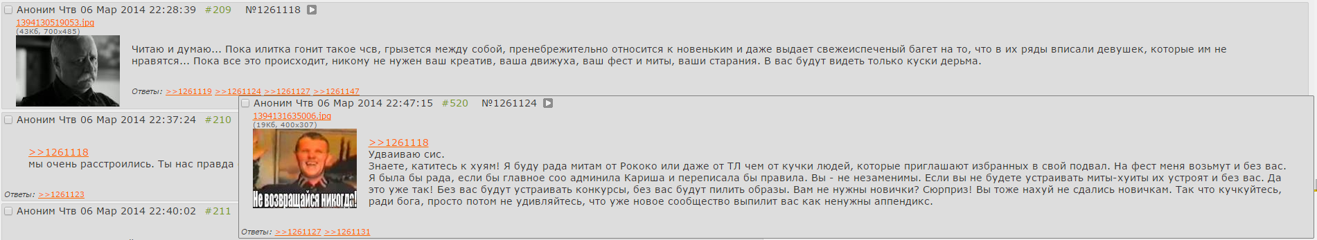 Но я не вижу смысла обсасывать каждую блядь фоточку рококо. Заебали уже - они обычные девки. Откуда столько интереса к ним? В соо участвуют постольку поскольку, на фесты ходят не особо активно - общаются в своем маленьком кругу. Жить не мешают. Нахуя эти тупые вбросы? З Мне от присутствия на лолитаче таких людей как ты противно. Которые 3ий месяц обсасывают событие не относящее к лолите никак. Реально затрахали этой ебаной свадьбой.
