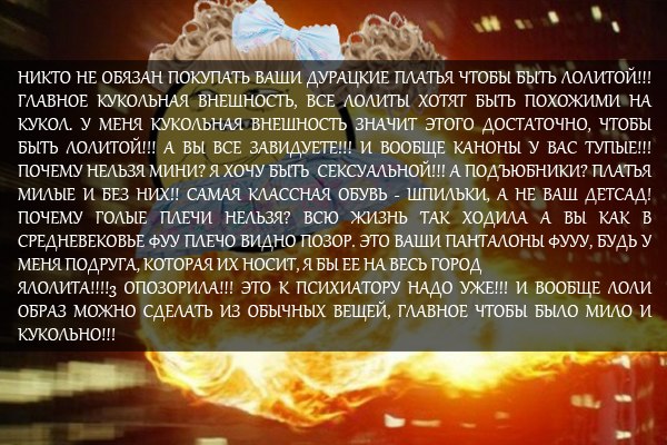 Не, гуро-лолита конечно не айс и там есть, что покритиковать, но! Джинсы вылила свою критику на стене группы феста, что моветон и лютый пиздец. И критика именно от нее базировалась лишь на том, что "гуро - значит с кровью и токо тааак!". Вообще пушка: > Каноном любой лолиты является пышное платье длиной ниже колена ,закрывающее плечи, желательно и локти тоже. - говорит "гуро" > все что вы сказали про пышность и колени и т.д...эм...это означает что о лолите вы не знаете абсолютно ничего ибо вы новечёк в лолите... - отвечают джинсы Ну ахренеть теперь!