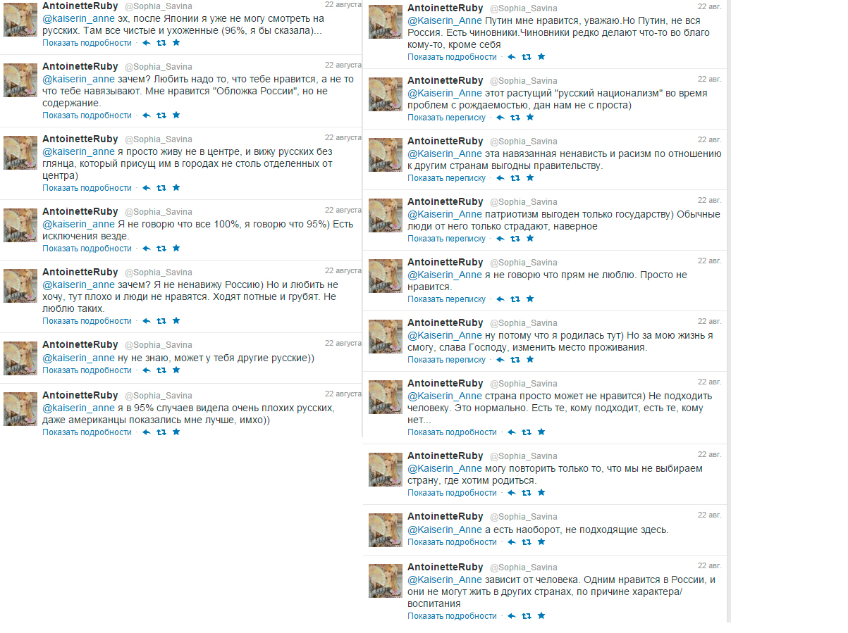 >>18257 Вся суть срача в том, что Дробинина повела себя как бешеный ватник, когда С писала,что если она и недовольна Раиссей,она в любом случае не ненавидит ее.Что она писала я не знаю,тви был закрыт, а сейчас она и вовсе его прикрыла.Ищите на тви Савиной ответы от 22.08.