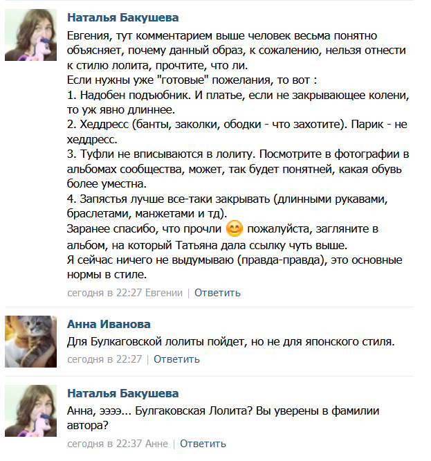 >>21336 >поясни хоть свою позицию Слишком много открытого мяса - создаётся ощущение "почти голой" лолиты. Если бы ты потрудилась чуть лучше (или наблюдала за стилем чуть дольше), то увидела, что обычно все забывают наляпать что-то на шею и получается то, что получается. У тебя даже на 4й фотке это видно, хотя это официальная промка. Длинные рукава ещё как-то спасают руки, но короткие - это полный пиздос. Посмотри, что народ творит с 2 и 3 пикрелейтедами - не знаю, как у тебя, а в лолите декольте всё же как-то... не принято выпячивать.