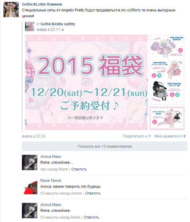 Дамы, пока вы там салатики строгаете и аутфиты наглаживаете, в главсоо такой дискач происходит! Классика - это недоделанный свит, можно ли кататься в готике на карусельках, Петуширр в бою, обманщица-похититель париков в нашем соо, разорванная жопа обиженного фотографа - и все в одном треде! Всем читать! https://vk.com/photo-178748_347327334?rev=1