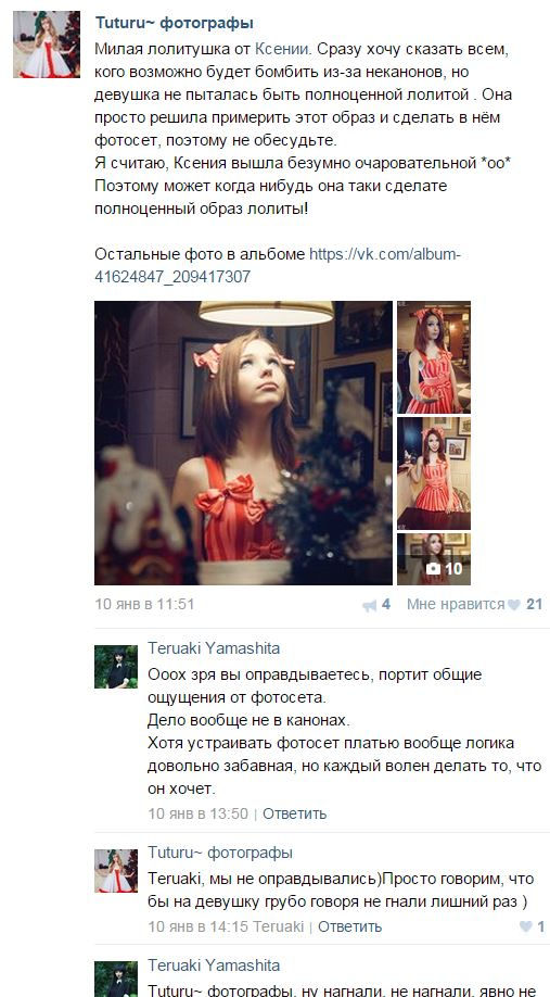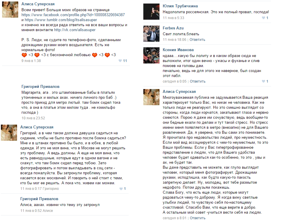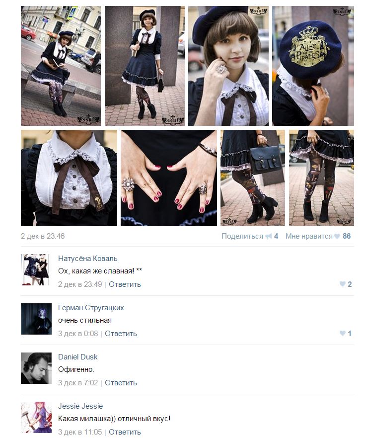 5) Я ношу вещи для своего удовольствия или исходя из их практичности. Я часто могу надеть что-то невпопад, если меня ждет какой-нибудь банальный поход за продуктами или перевоз вещей от парня до дома или наоборот, поэтому с внешностью не заморачиваюсь, заботит только гигиена. А вот если иду гулять с кем-либо / в кафе/ в кино / по магазинам, то уже тогда что-то стараюсь продумать. Лолиту надела всего один раз на глф, второй раз просто отфоткала, но фото разместила у себя только потому, что не вижу смысла пихать себя во все щели, да и в сложно меня вроде как не любят, как я понимаю. Поэтому и смысла нет там отствечиваться теперь, мне хватает просто читать новости. Хотя вот тут не знаю, чем я вам не угодила и что я вам сделала. Когда вы уже скажете, чем я вам конкретно насолила?