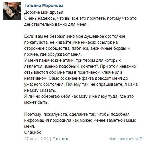 >>20642 Я проиграла с финальной фразы Мироновой: >Мда, Дана, я в Вас разочаровалась. Это и смешно, и как-то грустно. Так разве можно говорить людям? Особенно на публике? Это же практически публичное унижение, ужасная грубость. Мне плевать на эту тян и на Миронову тем более, но мне не хотелось бы видеть такую пассивную агрессию в нашем соо. Мда.