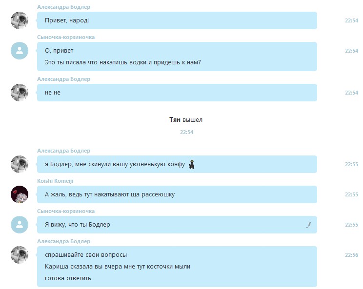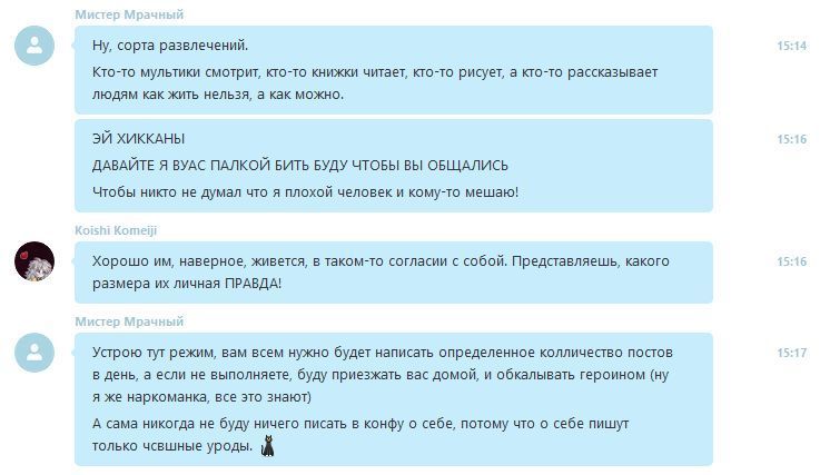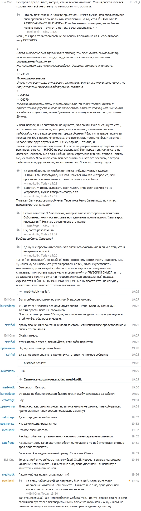 >>24318 >что мешает завести беседу >конфа, планировавшаяся для хикк Кто общался? Школьницы, шликающие на каришу? Которой явно насрать на посты, не имеющие отношения к ней? Прости, но если она и любит общаться, то только о себе. В такой атмосфере ЗАМКНУТЫЕ люди не могут ничего начать. Небольшой обсервейшн -вокруг нее остаются либо такие же омичи и воннаби, либо школьницы, потому что все остальные с мозгом очень быстро просекают, что неинтересны ей. >Вчера весь день, например, все общались со всеми голосом до самого позднего вечера и с омчами Потому что вечером кариша свалила в театр, и сорь, но это время ламповее всего было.