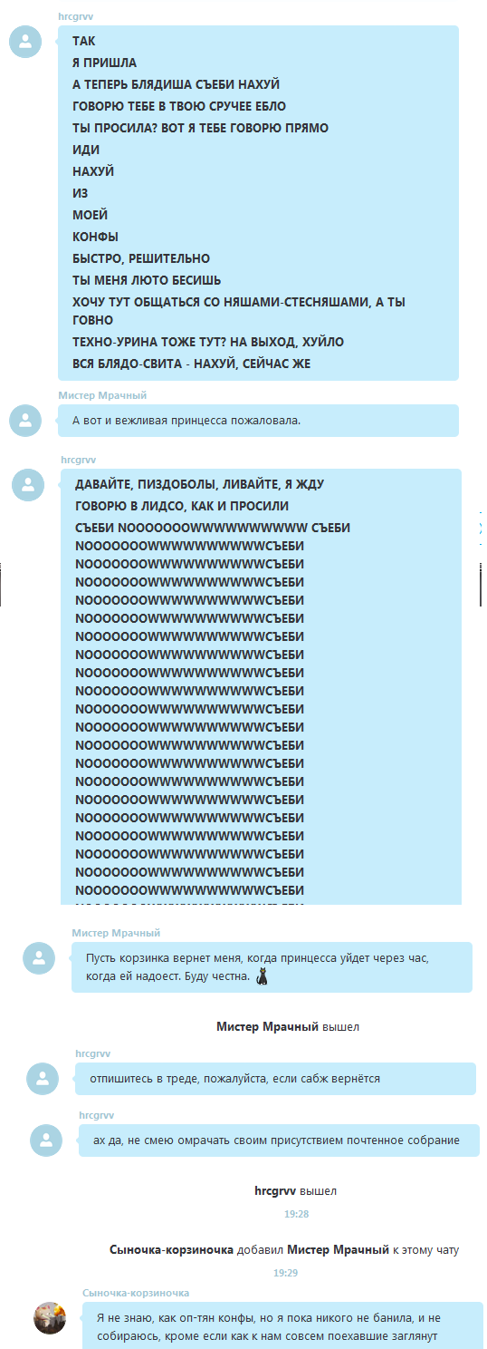 >>24432 Да ты заебала. Даже из блядской конфы превратили бог весть что. Что за соревнования, блять? Против Хуиши никогда не имела ничего и всегда нормально к ней относилась. До сего дня. Это же анонимная конфа - хочешь общаться - общайся. Но блять, они ведь даже по именам друг к другу обращаются, когда нормальные люди запилили себе фейкоскайпы. О чем это говорит? О том, что Карише надо, чтобы все знали - что это она, ни в рот ебать охуенная, привела свою свиту и, главное - в первой пятерке вступивших. Ей не общение нужно, а другое. Нахуя Бодлер в лоли-конфе? То, что она подруга Кариши? Или то, что пыталась в соо раз потное платье в продажах продать, как абсолютно новое? Конфа - это конфа. Здесь хотели лампово общаться лолитки, и не устраивать из этого какой-то колизей. Вот Кариш, почему бы тебе не общаться с лолитами как просто лалита, а не Кариша? В созданной для анонимного общения конфы?