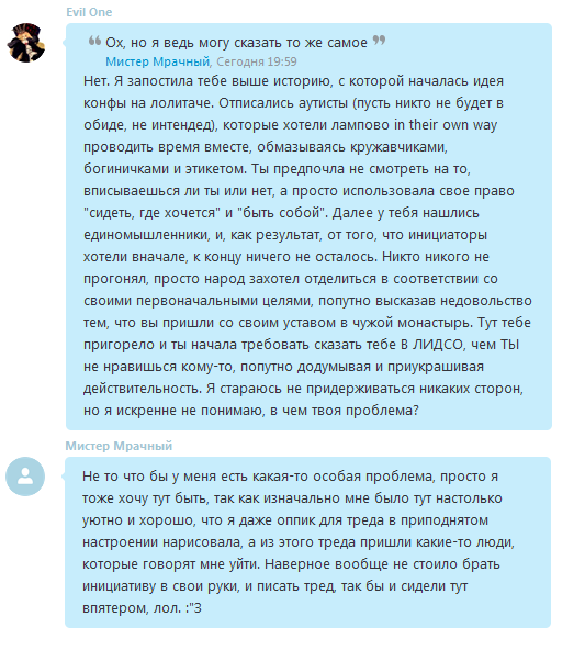 >>24361 Я себя позиционирую как себя, а ваши ярлыки мне нахуй не всрались. Прости за грубость, но вы меня заебали, если кому-то не понравится то, что я сижу в этой конфе, кроме тех двух с половиной человек, кто даже не написал мне это в лидсо, то я оттуда тут же съебу, потому что мне не за чем быть в месте, где я мешаю. А пока выпей чаю, и иди пообщайся с кем-нибудь ещё.