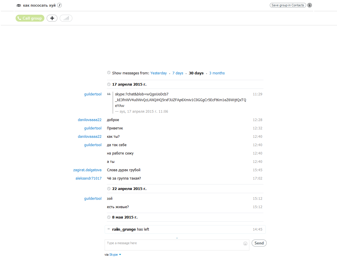 А я внезапно скучаю по скайпоконфе. Супер-хинт, если когда-либо кто создаст заново: пользоваться командами скайпа лучше и прописывать не автоматическое добавление по ссылке, а лишь по одобрению, ибо не сожрали со своей политотой мимопроходилы.