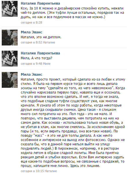 Алсо >не превратиться в пеструю кучку недоразумения Суперскую никогда не смущало и я продолжаю настаивать на том, что одна из пар точно окажется у неё, хотя возможно и после того, как "вложившая полугодовалую душу и любовь" дезигнер протрезвеет и обнаружив себя в рыночных условиях, сделает "неслыханную распродажную скидку" с барского плеча. Хотя вангую всё равно в себестоимость она зассыт опускаться.