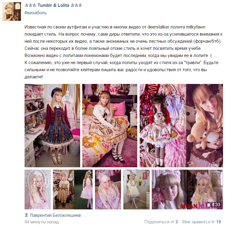 >>26070 Ой, нашли, кого оплакивать. Милкифавн - аттеншонблядь еще та, сколько лет её ничего не колыхало и тут на тебе - припекло так, что решила бросить любимый стиль? Пф, ни за что не поверю. Скорее, это акция на публику, ибо что мешает ходить в лолите и не светить еблом в каждую бочку - для меня ебическая загадка.