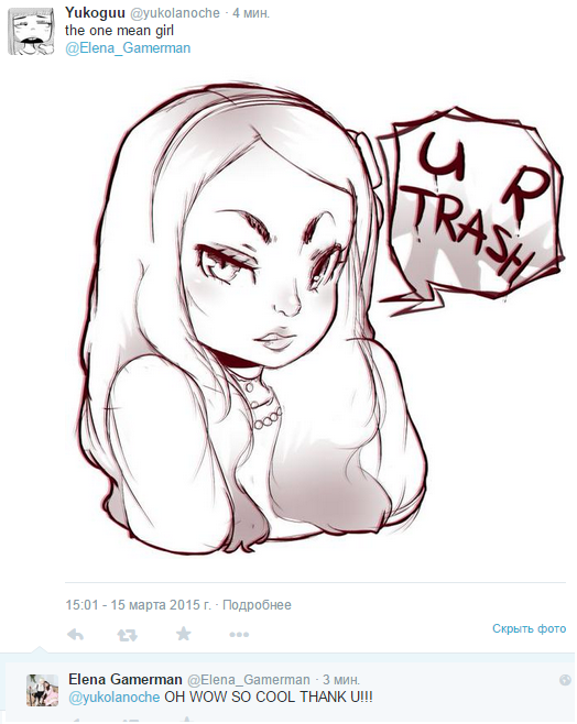 >>26756 Думается мне, что это к комментарию Плечей в сторону её же собственного фото из недавнего сета "Засоряю вам ленту своей стервозной миной >< ". Ну и прочей хуйни, что "от доброго" пишет Плечи в своем твитере, типа в защиту друзяшек. Но мне всё равно смешно, особенно от благодарности в любом случае. Не самый лестный образ для рисунка.