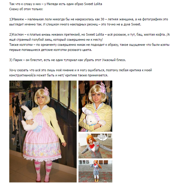 >>27225 Все дело в том, что он СОВЕРШЕННО не понимает сути лолиты. Лолита - это не косплей "ня, здрасти, зацените мой костюм из розового атласа, десу". Лолита - это не псевдоинтеллектуальная реконструкщина. Лолиты - это не нимфетки, анимешники или готы. Лолита - это стиль, где все могут побыть леди - прекрасными, утонченными и возвышенными, коими они на самом деле и являются.