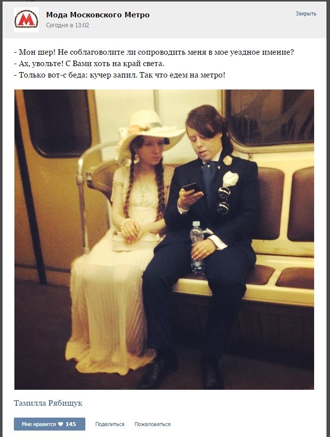>>27271 Надеюсь там все хорошо в комментариях? Я принципиально не хожу в эти паблики, а то у меня панталоны не настолько жаропрочные. И интересно, как Лизоньке не жалко подол светлого платья? :с Действительно такие элегантные господа не должны мораться о быдло-метро. Колян, го на машину уже зарабатывать во имя светлых подолов своей леди!