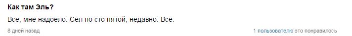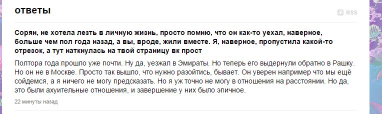 "Причина, по которой мы расстались, это то, что мы нынче просто немного в разных мирах. Я в Москве, а он в Тамбове, __тусит с какими-то убийцами.__ Ну и сам немного не чист ручками. Сейчас я просто хочу спокойно жить с другим человеком, что я и делаю. __Мне надоели эти суды, проблемы, и так далее.__ Хочу обычную жизнь, а не как в дёшевом боевике, мне такое немного надоело. Он в курсе, он раньше вас всех был в курсе, он раньше вас всех знал о свадьбе, потому что это нормально, обсуждать все с близкими, прежде чем пиздеть об этом на каждом углу. Он даже читает это, потому что благо во дворе 2015 год, и __у него есть доступ в интернете там, где он сейчас находится,__ и отвечаю я на этот вопрос скорее для того, чтобы он прочёл. Ой, Рика, кстати, ты мне снился сегодня. А ты, дружище, пойди пообсуждай свои проблемы связанные с моей личной жизнью где-то ещё, хватит тут прохлаждаться."