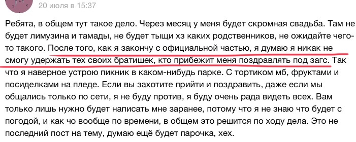 Вообще, имхо, вся эта драма с "была с одним, вышла замуж за другого!1!111!" сильно раздута. Конечно, все немножко странненько на мой мимокрокродилий взгляд, но ведь свадьба это не обязательно ЛУБОФЬ ДО ГРОБА ЖИЛИ ОНИ ДОЛГА И ЩАСЛИВА, КАРИША НА КУХНЕ В БИГУДЯХ И ХАЛАТЕ С БОРЩОМ В ОБНИМКУ ВОСЬМОГО РОЖАЕТ, КАНРЯ РАЗЛАГАЕТСЯ С ПИВАСИКОМ В ТРЕНИКАХ НА ДИВАНЕ, МАШИНА ИПОТЕКА ЦЕРКОВЬ ПО ВОСКРЕСЕНЬЯМ, но и дополнительные юридические плюшки. Даже элементарно если загремит кто из них в больничку, то какого-то левого лучшего в мире друга на хуй пошлют, а вот мужа/жену спокойно пустят. Ну и так далее дальше по списку. В общем, с событием вас, новобрачные!