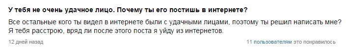 Другое дело - сливать такое в чуть ли не паблик имени себя с несколькими тысячами подписчиков... Ну не знаю, я так не могу. Я как-то вот не могу себя успокоить мыслями о том, что "это моя страница, что хочу - то и пишу". На дворе 2015 год и отмахиваться от мимокроков высказываниями уровня "не нравится - не читайте" уже как-то не очень. Что значит "не нравится"? Нам-то толком абсолютно всё равно, что там человек о себе пишет, ибо нас это не касается. Что бы он там ни делал - нас это не касается. Мы просто для себя так или иначе делаем выводы и сам человек для нас становится плохим или хорошим, исходя из того, как он ведёт себя в интернете. И это уже вопрос, насколько человеку норм то, чтобы о нём составляли мнение по тому, что он пишет. Тут, скорее, правильнее будет развернуть тезис наоборот, как "не нравится чтобы о тебе думали плохо или ещё как-то, как бы тебе не хотелось - не пиши". С инфантильных позиций эгоцентристов, у которых мир вращается вокруг них, это, конечно, звучит дико, но мне кажется, это немного ближе к реальности, чем нелепые обвинения "вот ведь люди мудаки, считают меня плохой за то, что я пишу всякую херню".
