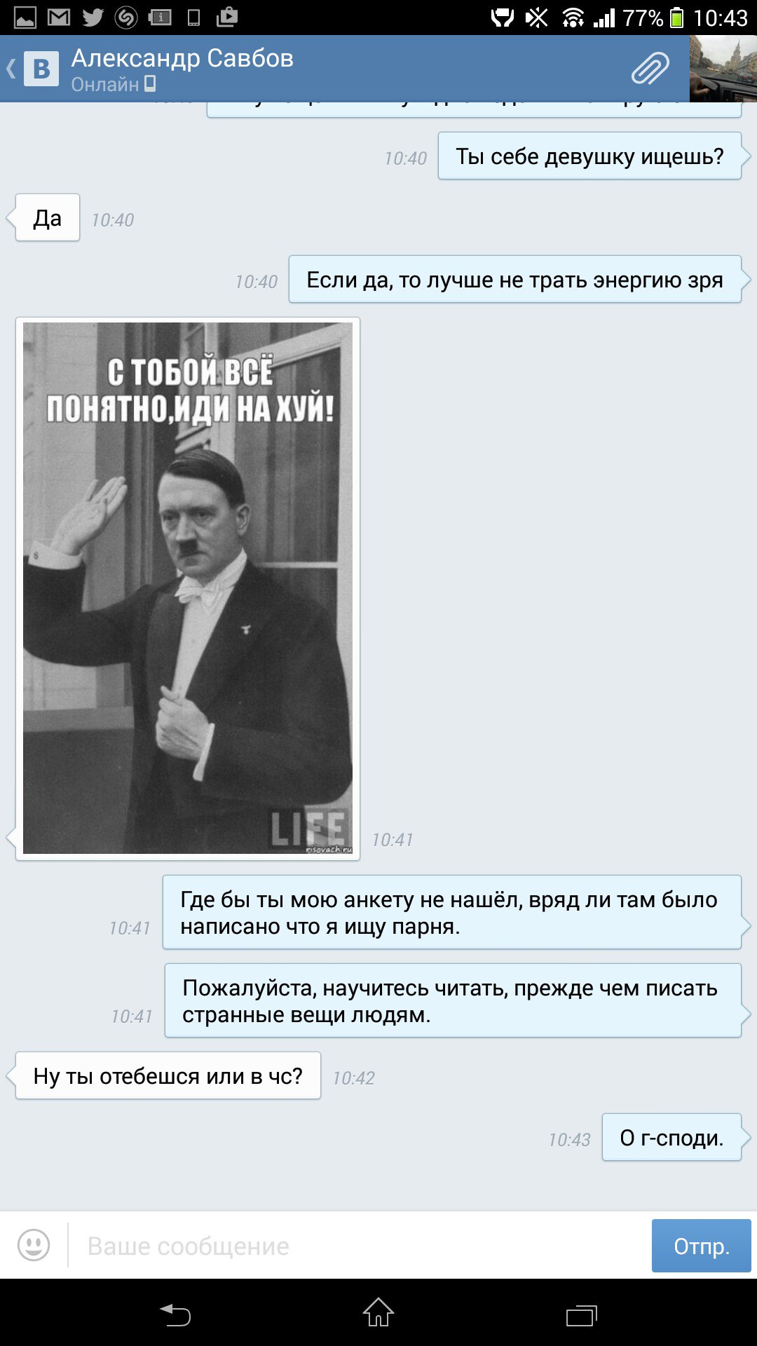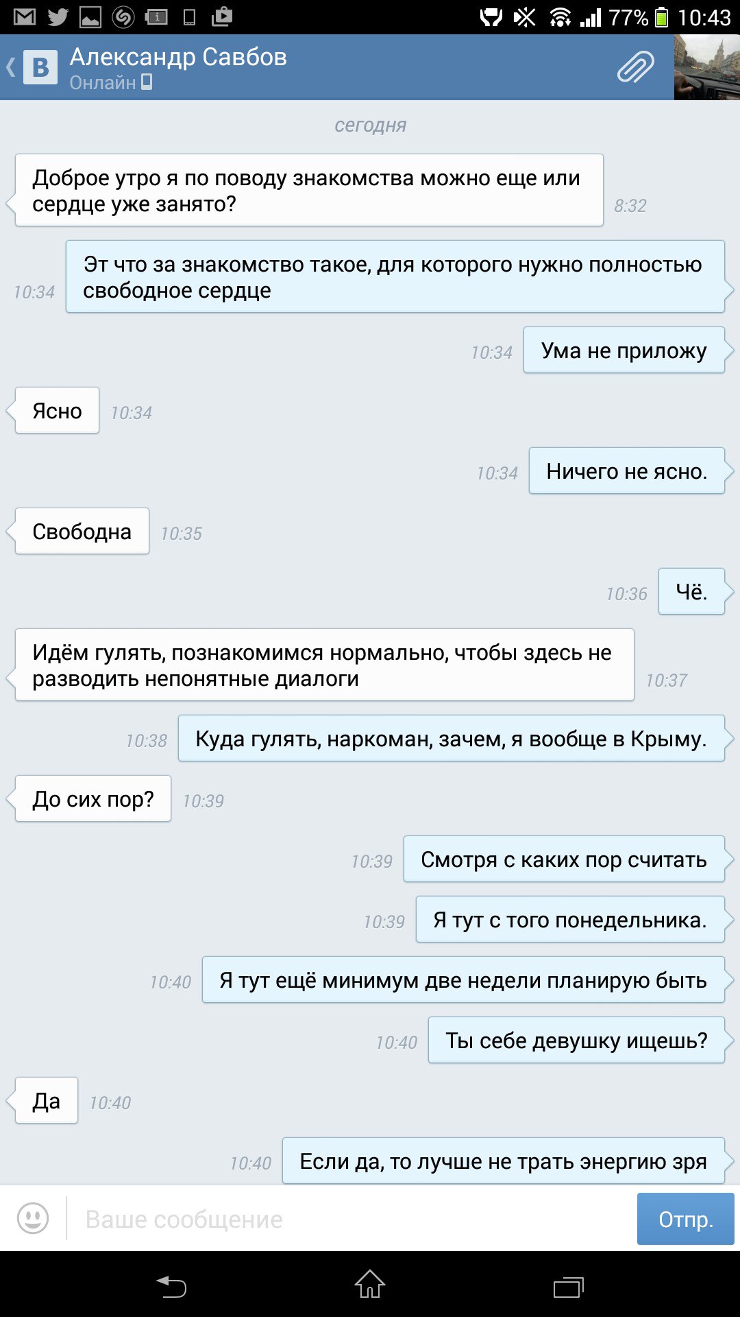>>34673 Никак не могу понять, кто более жалко выглядит - недопикапир, начавший быковать уже в первых 10 сообщениях, или карина, которая выдаёт какие-то толи шутки, толи просто выёбывается (выглядит в любом случае убого), да потом ещё и выкладывает это всё на стеночку, чтоб все поняли, какая она крутая и как ловко затролила мудака.
