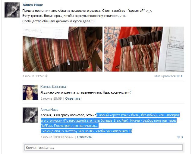 >>33494-тян Уютный, что делать? Заказала у Шивэй платье к ГЛФ (первый заказ от неё). Она написала, что выслала, доставку я оплатила. Прошло уже 2 месяца с момента отправки, по трэк номеру новостей нет, уже полмесяца обещает разобраться, сейчас просто игнорит мои сообщения :с Мне страшно, сисы. Никому здесь случайно не приходилось возвращать у неё деньги?