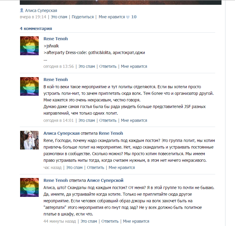 Товарищи, это пиздец. Если уж и делать ставки на того, кто больше скандалит, то я выбираю Суперскую. Чем больше я узнаю эту даму, тем противней мне от нее становиться. Рене я не очень люблю, но здесь она права. Зачем это afterparty? Суперскую орги GLF покусали? Валентинки, приветствие иностранной гостьи.. Ничего не напоминает? И да, Алиска-то не очень хорошо руководит своими митами. Когда я приходила на мит, устроенный ею, она сидела и общалась с Пуховиком. Тащем-то на остальных людей вне ее тусы ей насрать.