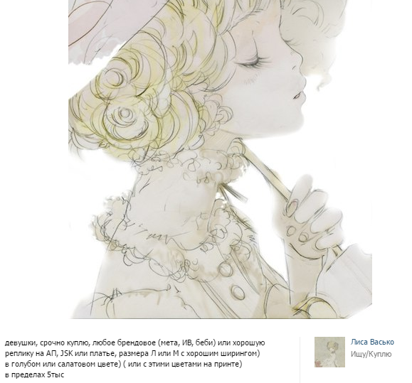 Лолитач, почему мне так бомбит от реквестов в соо продаж с указанием цены? От этих всех желающих купить платья за 2к и блузки за 1к. Как будто они из моего шкафа их хотят взять за эти деньги. Откуда они вообще берут такие цены? Или им нужны вещи, изношенные до состояния половой тряпки? А еще начали появляться реквесты "только с рук, не успеваю к ГЛФ". До него еще 2 месяца! Какое не успею?