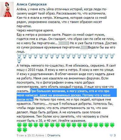 >>32656 ну что за жесть.Если админишь группу - будь вежлива и соблюдай нейтралитет, отстрани свои личные неприязни. Особенно если имеешь дело непосредственно с людьми. Конечно, Рене тоже не образец вежливости и такта, но Алиса не должна была отвечать хамствоМ и обвинять в чем-то Рене. Выглядит гадко. >>32658 Ну типа "25 лет в стиле, админ митов, богинька". Решила, что может все, вот и проявляет истинную сущность.