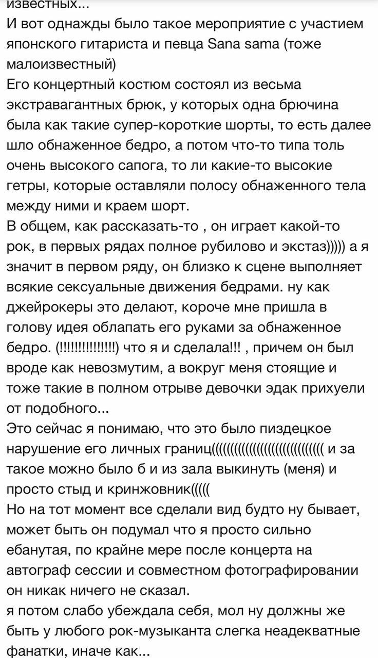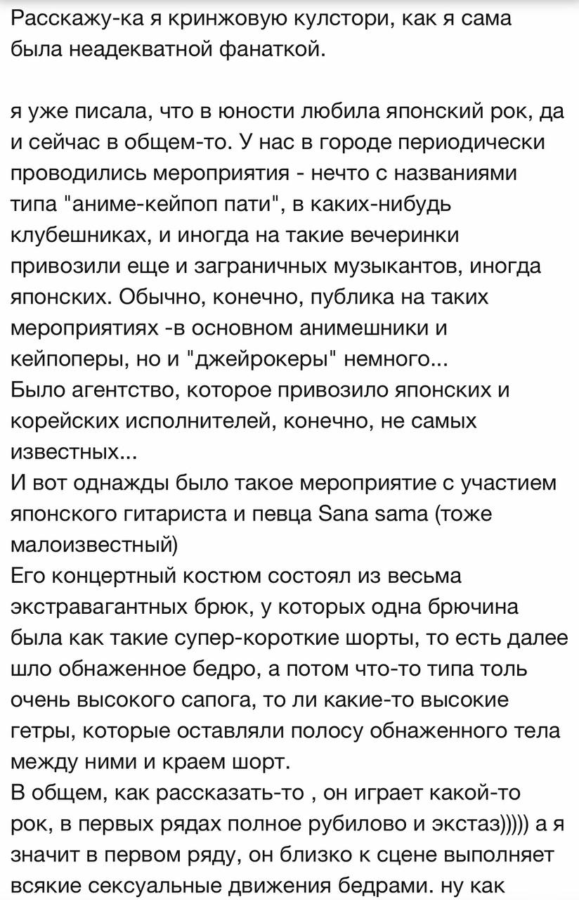 Ну и истории, конечно. Хочет, говорит, музыку послушать, но ей какой-то фендом мешает. Хочешь слушать - качаешь/гуглишь и слушаешь. Каким боком тут фанаты вообще? Слежу за новыми группами, слушаю - ни разу описаных инвалидов не замечал. Это целенаправленно где-то не хило так порыться надо, видимо. Только зачем - не ясно. >>33257 Алсо, что красивого? Ни о чем фотосет, как по мне. Первый вообще старушенцию косплеит. Не вижуал даже уже, к тому же.