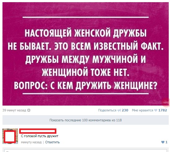 Возможно поэтому у нас в соо вопрос с репликами решается для каждой ситуации отдельно — большинство у нас психически здоровые и адекватные леди, способные отделять мух от котлет и не фрустрировать на ровном месте, тратя нервы на решение чужих, по сути, проблем.