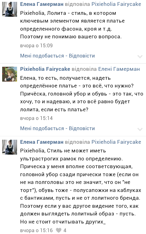 так вроде человек может не в курсе просто, что под парик не подбирается одежда в принципе... Скорее волосы подбираются под одежду. Не то чтобы защищаю, просто думаю, что лучше один раз объяснить ей (прочти, если читаешь это. Или ее подруга передай). Да и всем, кто приходит в стиль или, кто уже в нем достаточно, но все равно что-то не клеится (и что старички ошибаются, но тут любопытство и эксперимент, думаю, она успокоится в этом и порадует еще нас, чем нибудь более привычным :-D), что под платье подбирается коорд, не может быть отдельных вещей, которые как бы вместе, но отдельно от общего лука. Короче, сделать пост с уточнением канонов, а потом ссылаться туда.. Ну и все отлично, без срачей. Это хотя б разумно. А то мое любимое глав-соо превратилось в не анонимный двач.
