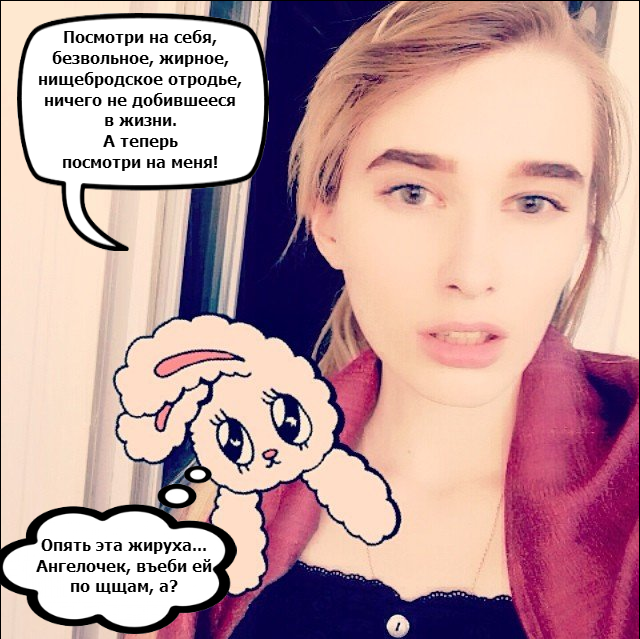 >>3798 Правильно, что решила не троллировать. Тянка выглядит пиздец не из-за торчащих костей. У неё отвратительные волосы, потемневшая грубая кожа с болезненным жёлтым подтоном (покрытая довольно длинными волосками по всему телу), впалые глаза и уродливые маленькие складочки, когда она пытается в улыбку. Она хочется выглядеть маленькой девочкой, а получается старуха. И организм тоже чувствует себя на 80. Мне нравится её тело, но куна её жалко (она не может в оргазм, инфа 100%) и лицо у неё выглядит старческим, но без морщин. Но она очень любит себя и наивно полагает, что будучи чуть полнее выглядела хуже. Просто очень жаль её. А ещё она виабудаун, а это непростительно даже для анорексобогинь.