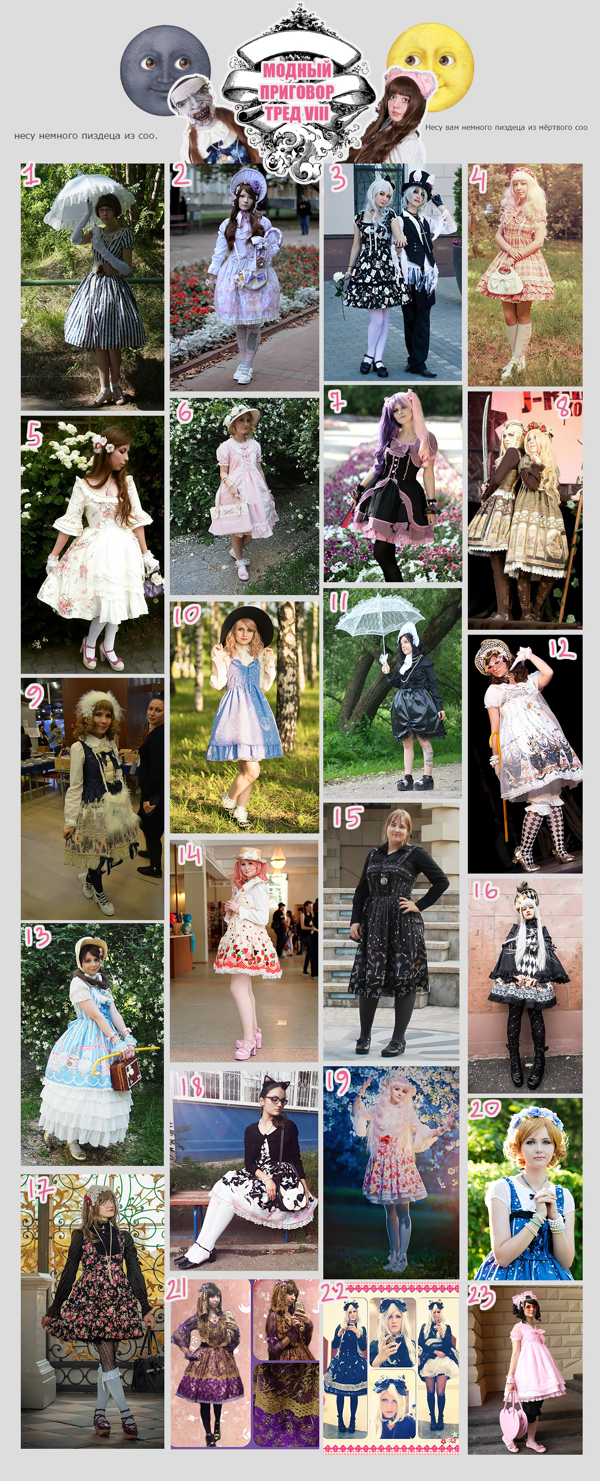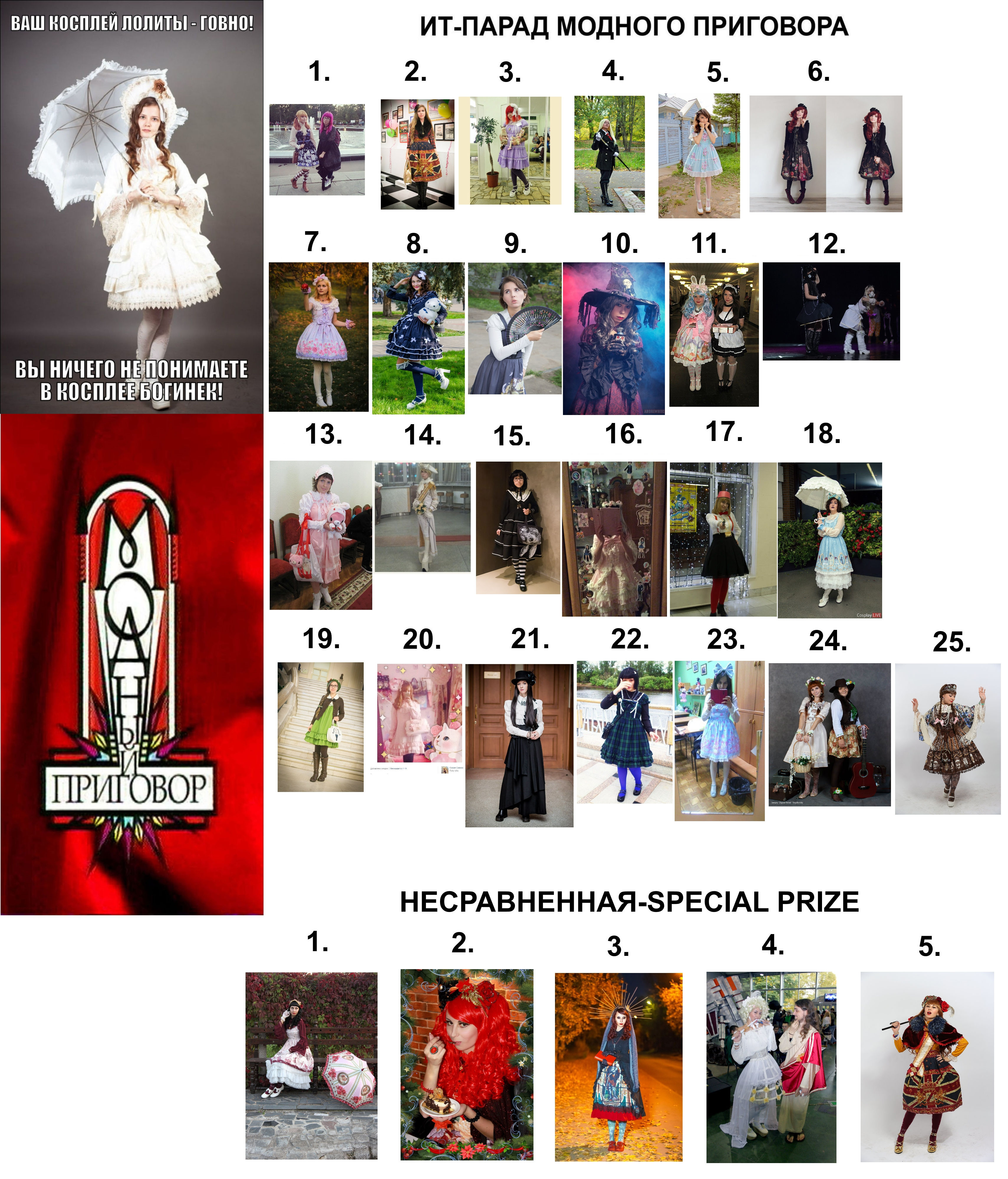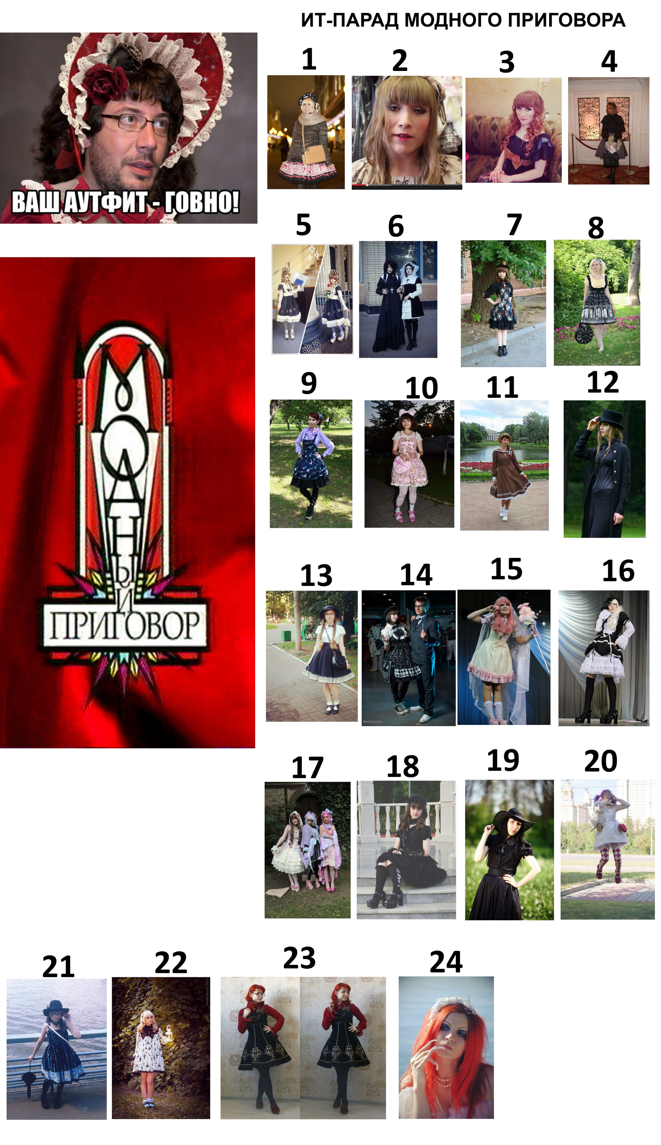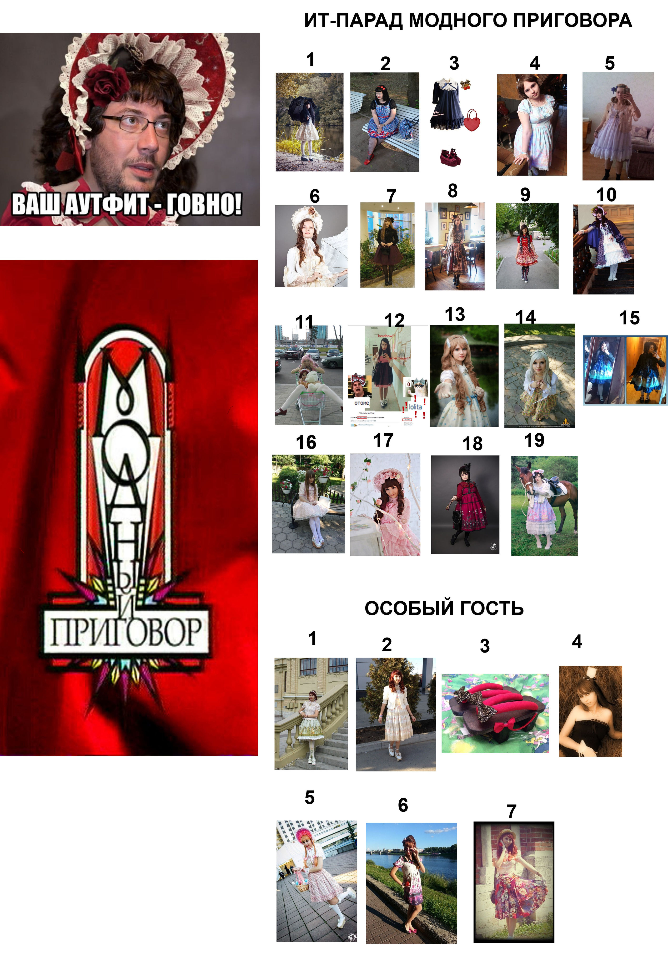 "сперма на кровати", "оскал", "пинап", так же относится сюда так же комментарии "высокий рост", "жирные/кривые/костлявые ноги/руки/тело", не говоря уже про части лица, и пр. про внешность, "отсутствие вкуса", "не сочетается", "а мне кажется, что..", "а человек плохой", "а потому что я так решила", "а потому что куна увела" и с какой-то стати люди должны подводиться под несуществующие стандарты, коим практически никто не соответствует в мире, а особенно в нашем стиле (еще и улыбка должна быть другой, ага, хоть пластику лица делай каждому из нас, а лучше пластику мозга). Более того не сможет соответствовать. Единственный стандарт в лолите - это КАНОНЫ и сочетаемость в цвете и стилистике, что здесь практически совпало и образ имеет право считаться приемлимым для лолиты, он достаточно прост, но это не отменяет его. И так мало здоровой критики и действительное соответствие названию "модный приговор" - практически = 0. Я имхо по этому образу высказала выше где-то (41000). Но унижение - это удел невоспитанных и слабых людей, которые сами в своей жизни еще ничего не сделали, как минимум годный лолитный образ. Не лолиты, а сообщество быдло. Надеяться этими комментариями как-то принизить человека? Лучше давать адекватную критику, а не гнобить на уровне учеников средней школы. Тех, кого вдруг забомбит от этого, просто еще больше подтвердят мои слова. Лично у меня вызывает это смех, мол, молодец, ты умеешь печатать связные буквы на клавиатуре, флаг в руки. Хотя, вы можете развеселить меня, почему бы и нет. Предлагаю сменить тред.