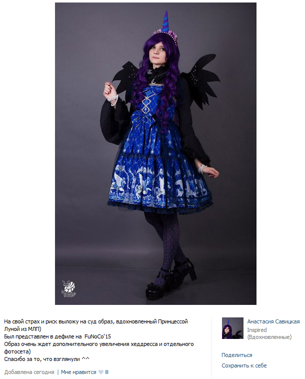 >>39419 Cис, у меня для тебя не особо хорошие новости... Это и есть косплей. С косплеерского дефиле. На косплеерском фесте. Только в лолитном платье. Если бы у нее был только легкий намек на персонажа, то это был бы инспайред, но тут действительно самый обычный косплей пони - рог, крылья, синее платье. И выбивается лишь парик, который для лолиты косплейный и не сочитается с образом, а для косплея не каноничный.