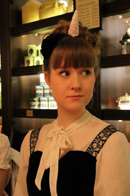 >>39424 >>39417 Мне даже рог тут кажется окок и напоминает такую вот шапочку, только маленькую (хз как он выглядел ирл). И именно то, что он на ободке, а не как-то хитро спрятан - напоминает именно аксессуар, а не косплей. Лично меня тут помимо парика больше смутили кружевные колготы моей бабушки + слишком уж простые/тёмные туфли... Я не знаю, какие бы сюда лучше подошли, но что-то с ними не так.