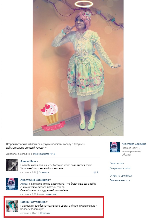 Я высказала свою критику, но в остальном не понимаю, за что так накидываться на человека. Почему вдруг образ стал не лолитным, только из-за того, что на кровати сфоткалась не с тем выражением лица? (и где канон на выражение лица..? Не будем об этом)
